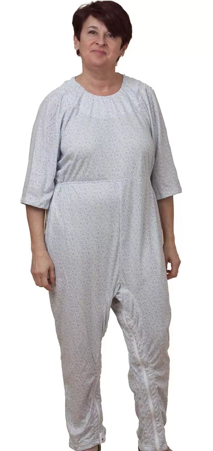 Les combinaisons de nuit une pièce fait en poly/coton doux sont résistantes, confortables et sans contention. Elles assurant le respect et la dignité des personnes atteintes de la maladie d’Alzheimer, de toute autre forme de démence, ou de troubles cognitifs, en leur restreignant l’accès aux sous-vêtements d’incontinence et leur empêchant de se dévêtir. La combinaison est munie d’une longue fermeture éclair au dos se sécurisant avec un bouton à pression au haut, d’une fermeture éclair à l’intérieur des jambes se sécurisant elle aussi avec des boutons à pression de chaque côté, de manches aux coudes, et de jambes longues aux chevilles. Elle est robuste et résistante, et permet un habillage pratique pour l’aidant et indolore pour le ou la bénéficiaire.
