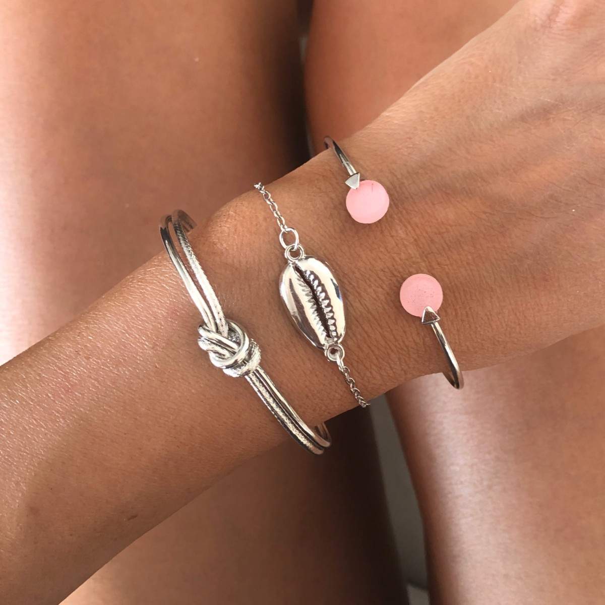 Ensemble de bracelets jonc plaque argent. Choisissez ce lot de 3 bracelets tendance 2022. Bracelet noeud, bracelet jonc rose et bracelet coquillage. S’ajuste facilement sur le poignet. Bracelets fantaisie en métal plaqué argent. Taille ajustable. Emballage cadeau offert!