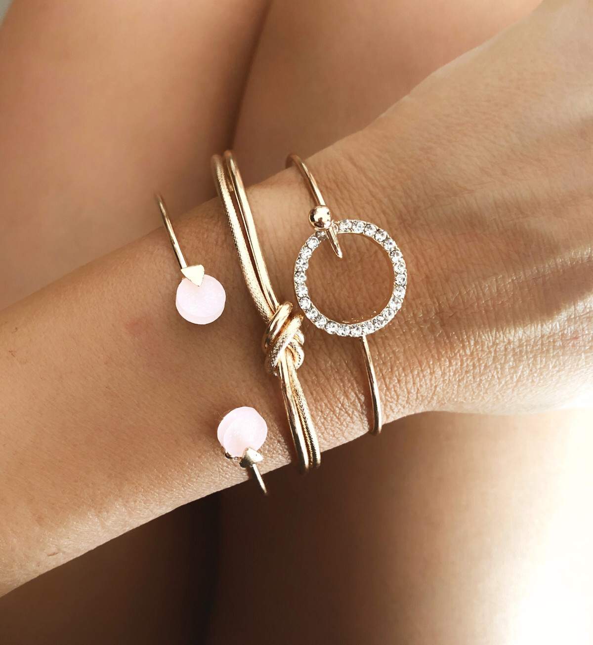 Ensemble de bracelets jonc. Choisissez ce lot de 3 bracelets jonc tendance 2022. Bracelet noeud, bracelet jonc rose, bracelete jonc cercle strass. S’ajuste facilement sur le poignet. Bracelets fantaisie en métal plaqué or. Taille ajustable. Emballage cadeau offert!