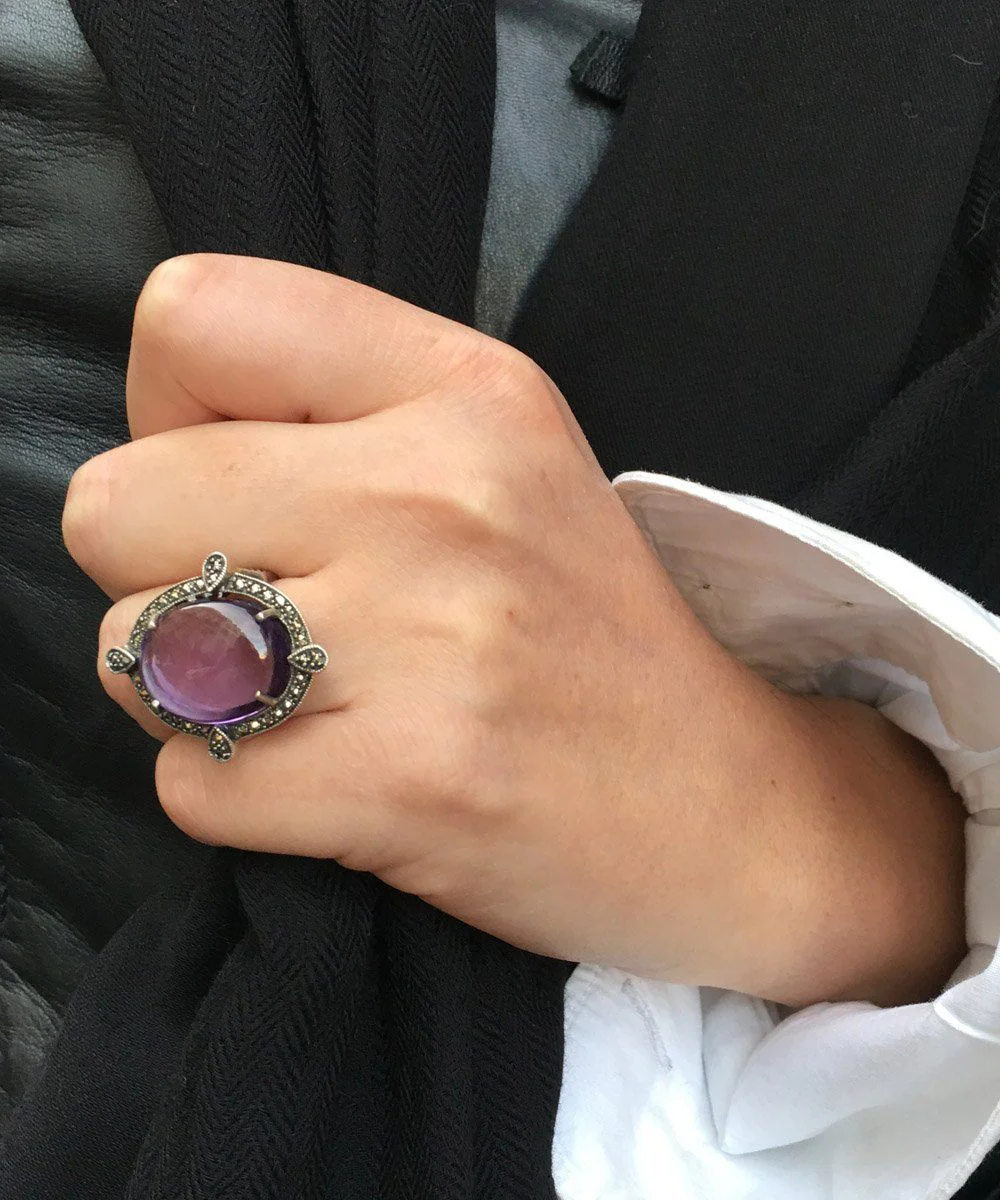 Grosse bague cabochon améthyste, argent et marcassites de style art déco