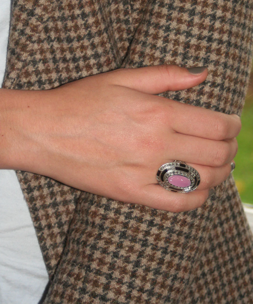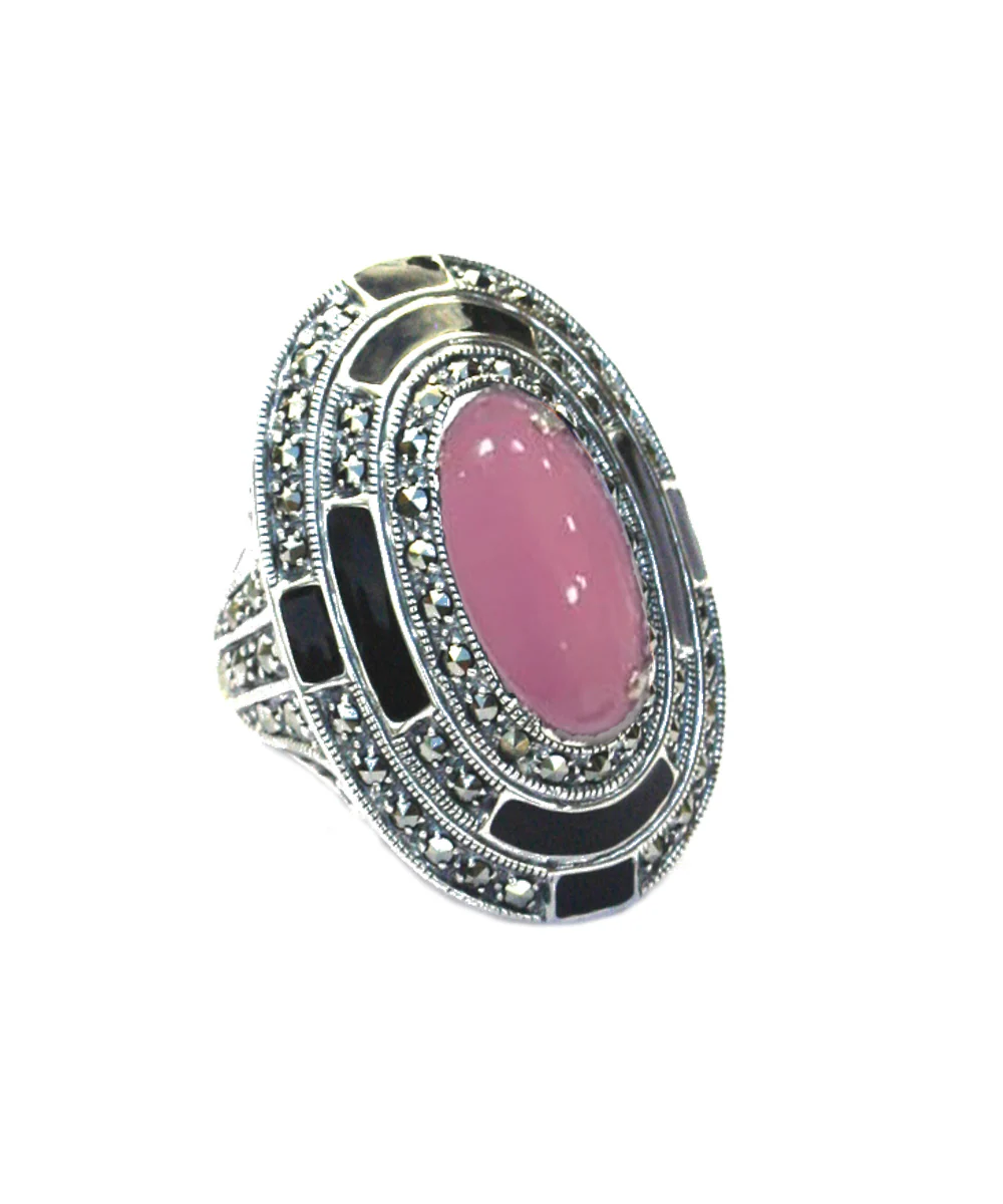 Bague Jade rose ovale en argent 925 avec marcassites et émail noir sur les cotés