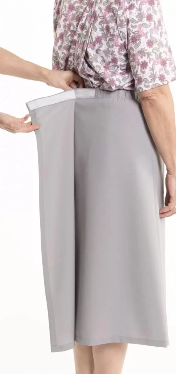 Jupe adaptée de style portefeuille munie d’une ouverture latérale complète, fermeture à velcro, et poche appliquée à l’avant.