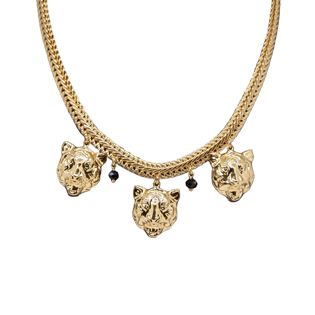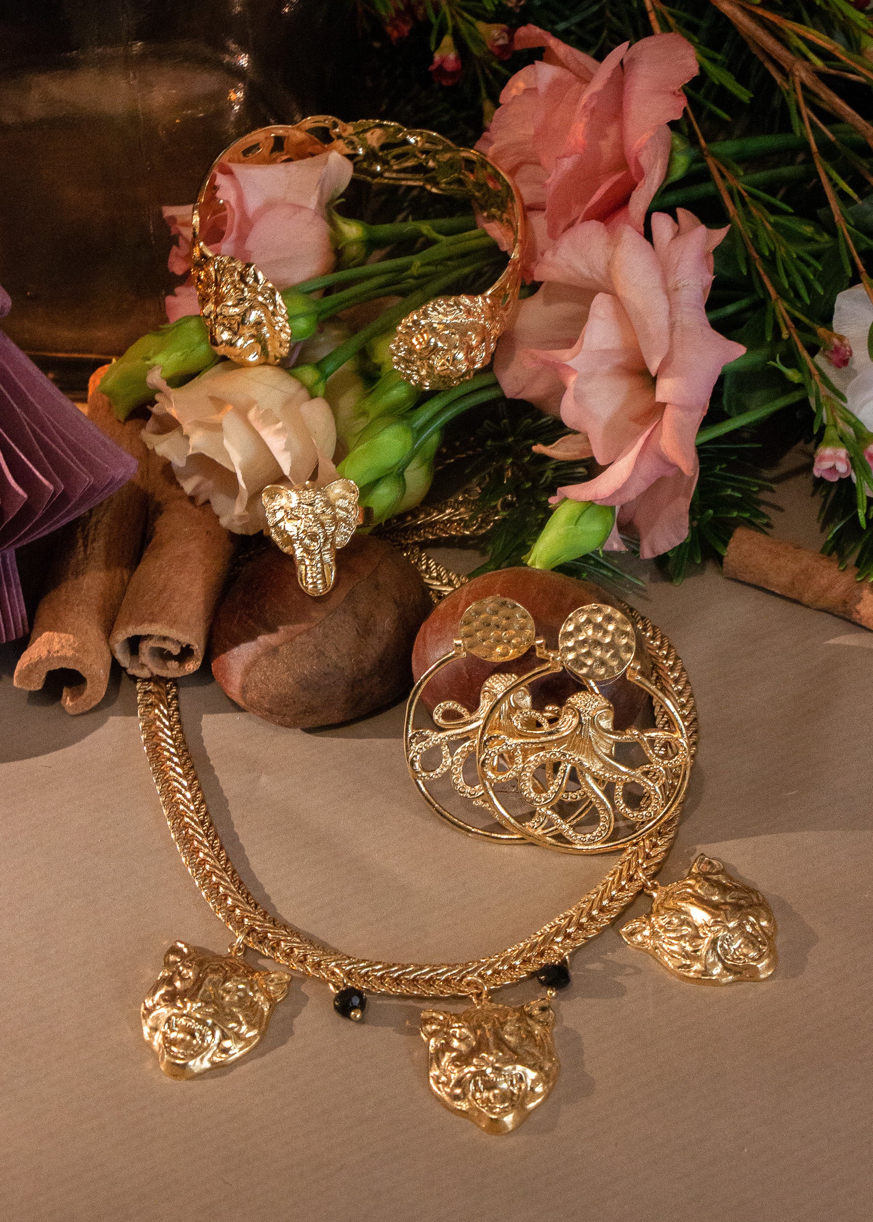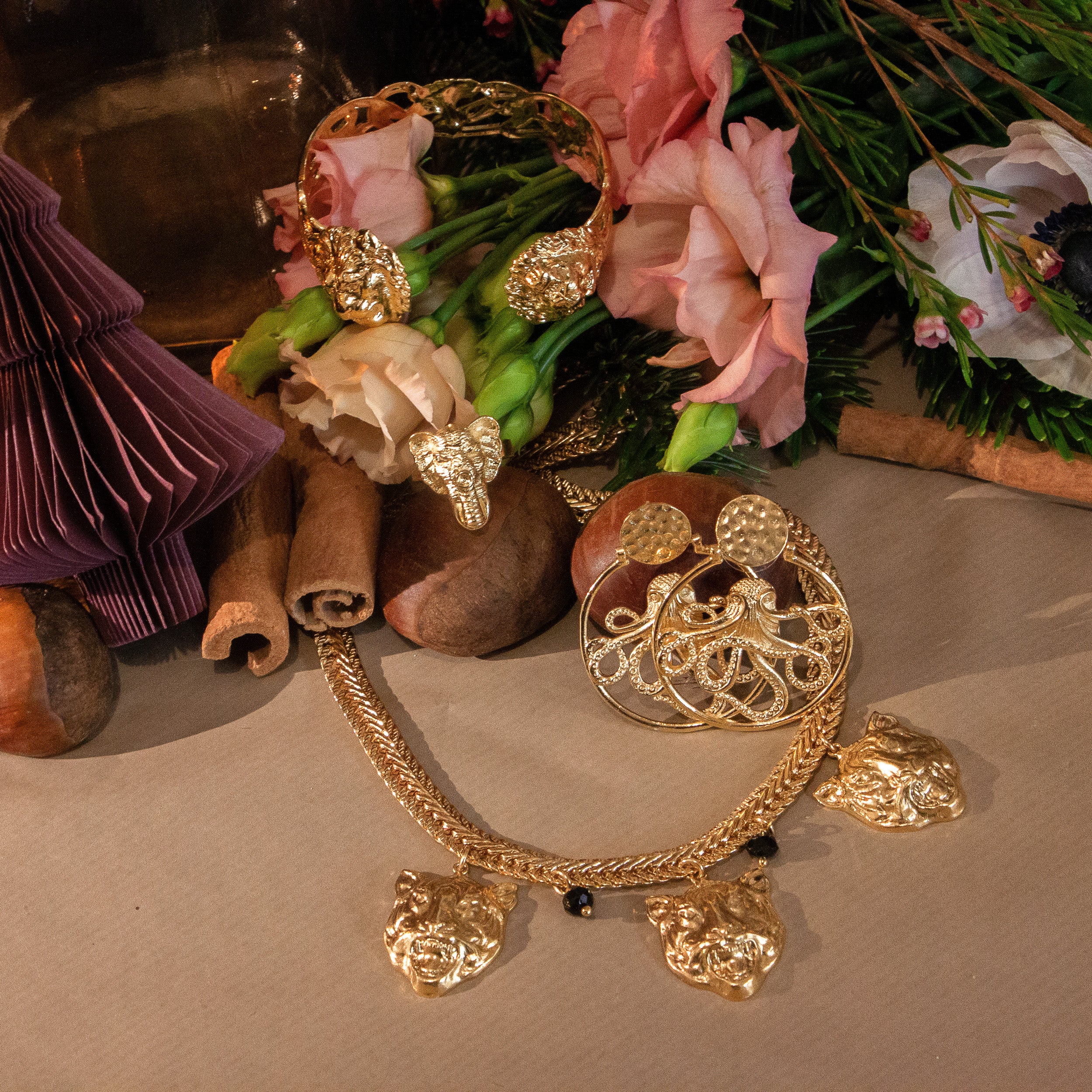 Idée cadeau inspirée de notre collection Bestiaire. Inclut un collier tigre avec pierres d’onyx, un bracelet exclusif double lion, une bague elephant, et une paire de boucles d’oreilles octopus.