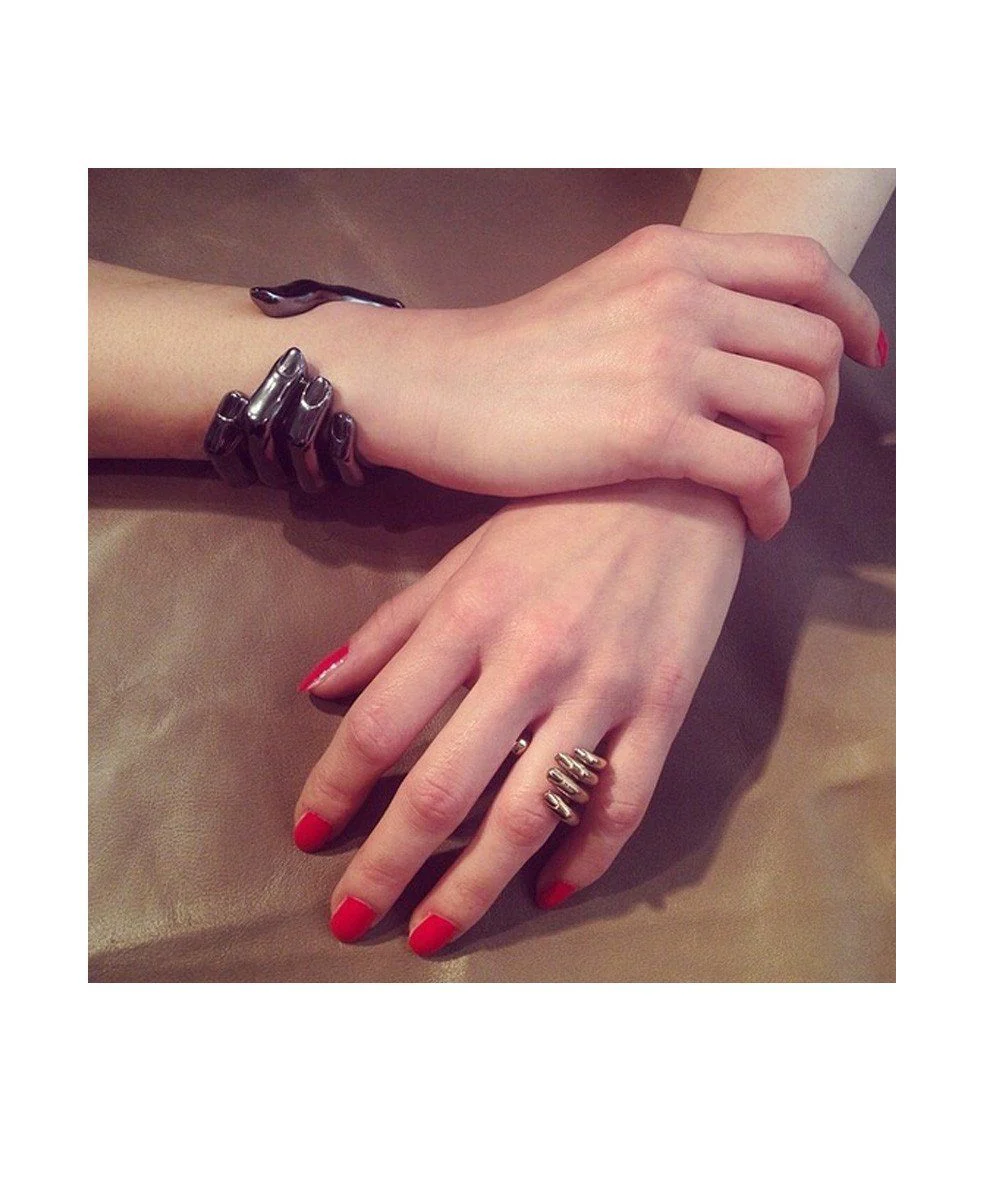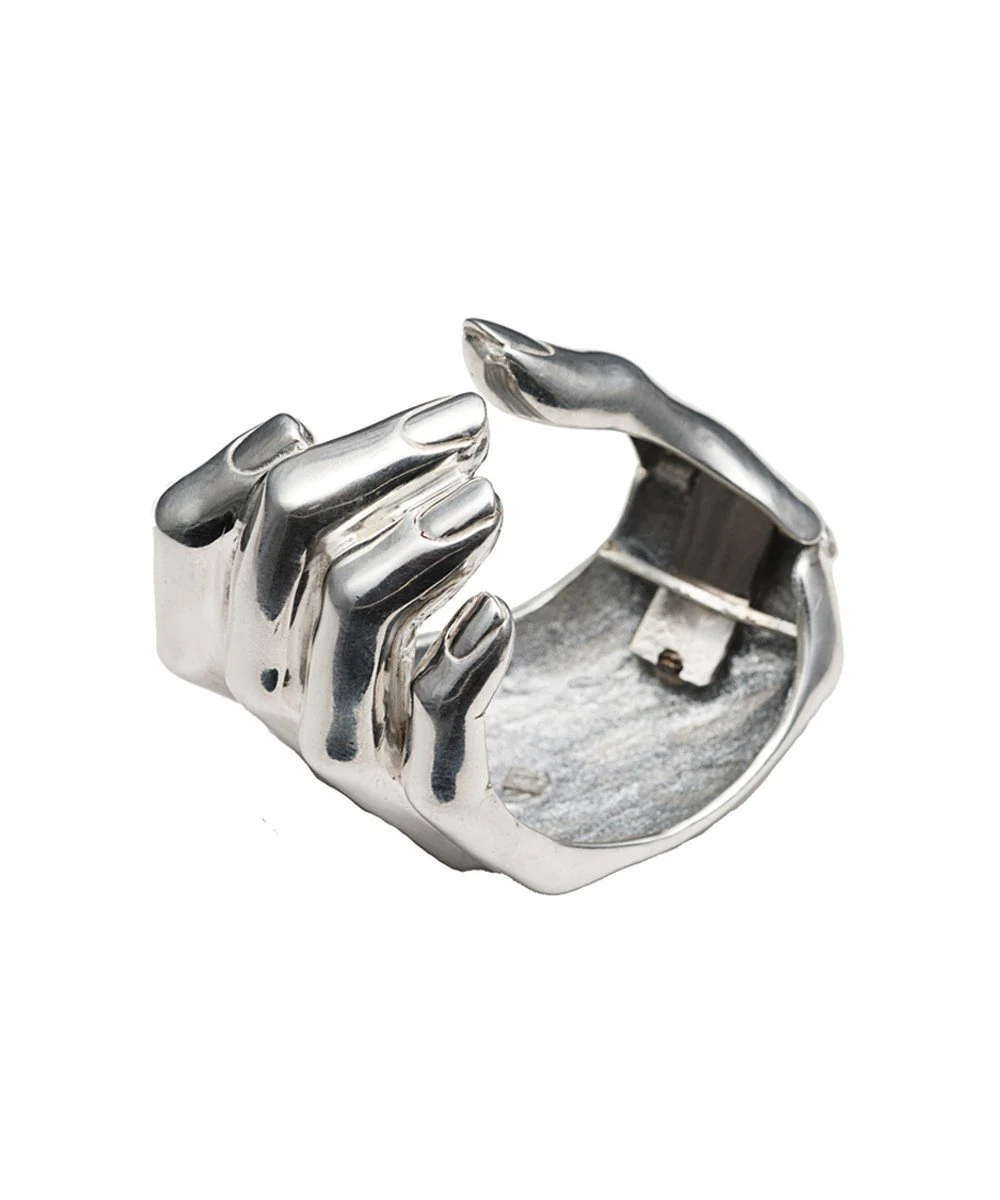 Manchette main en argent qui entoure le poignet par le créateur Bernard Delettrez. L’ouverture se fait grâce au pouce qui est articulé.