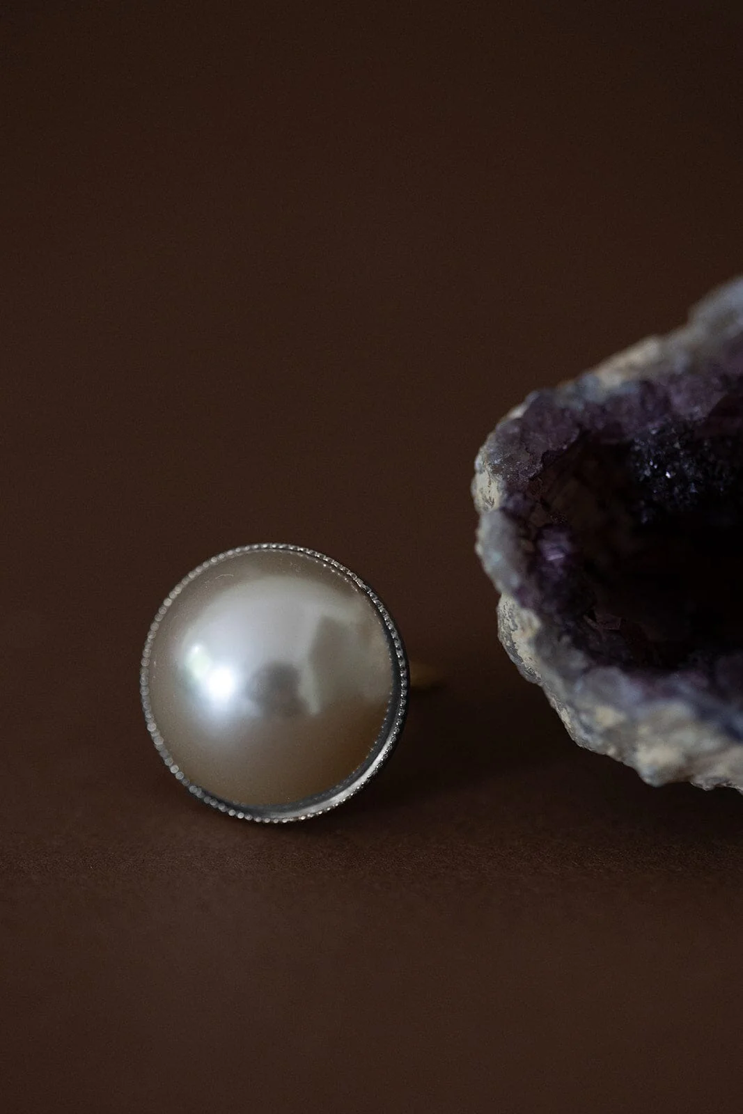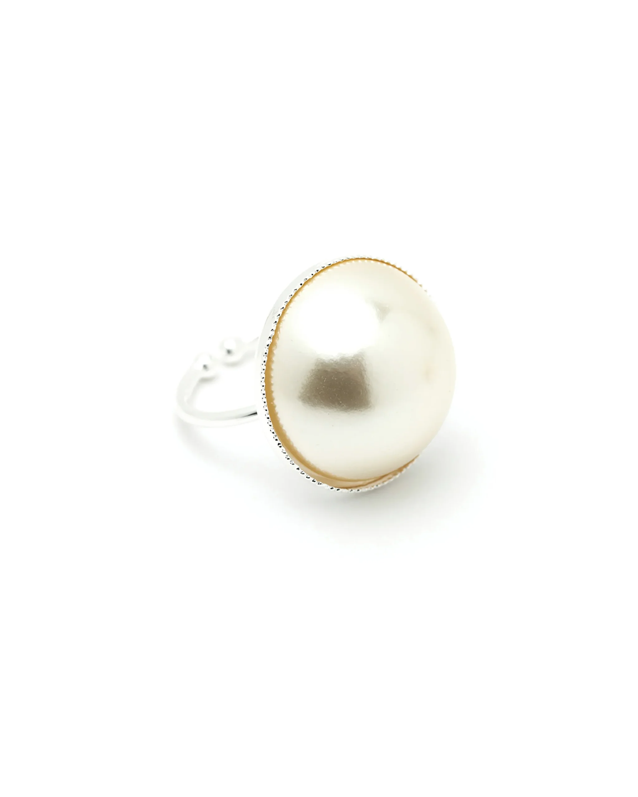 Maxi bague Nélya ajustable – Ø 2,2 cm – en laiton plaqué argent avec une perle cabochon crème.