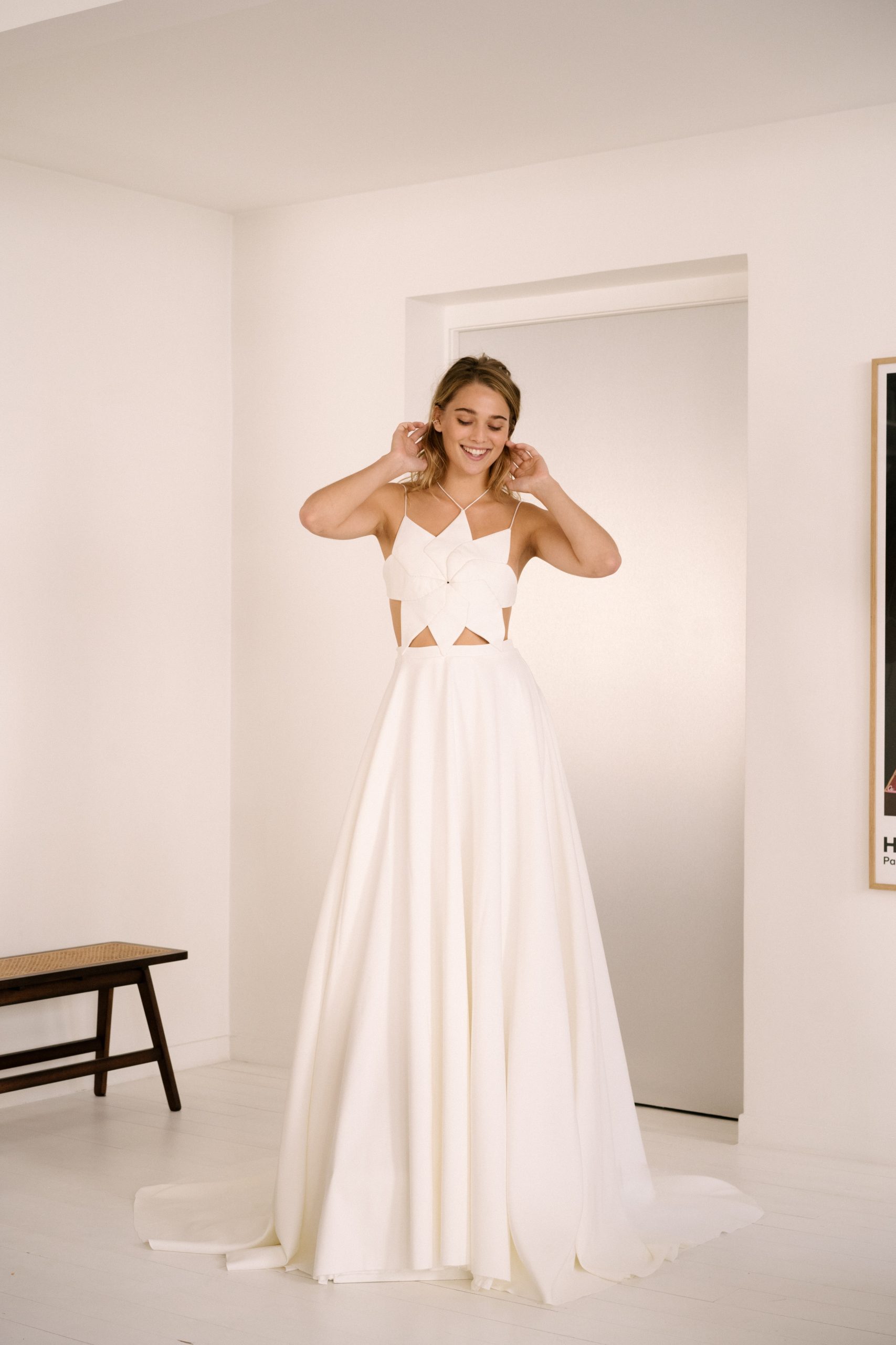 Robe à fines bretelles, découpe origami, en satin duchesse