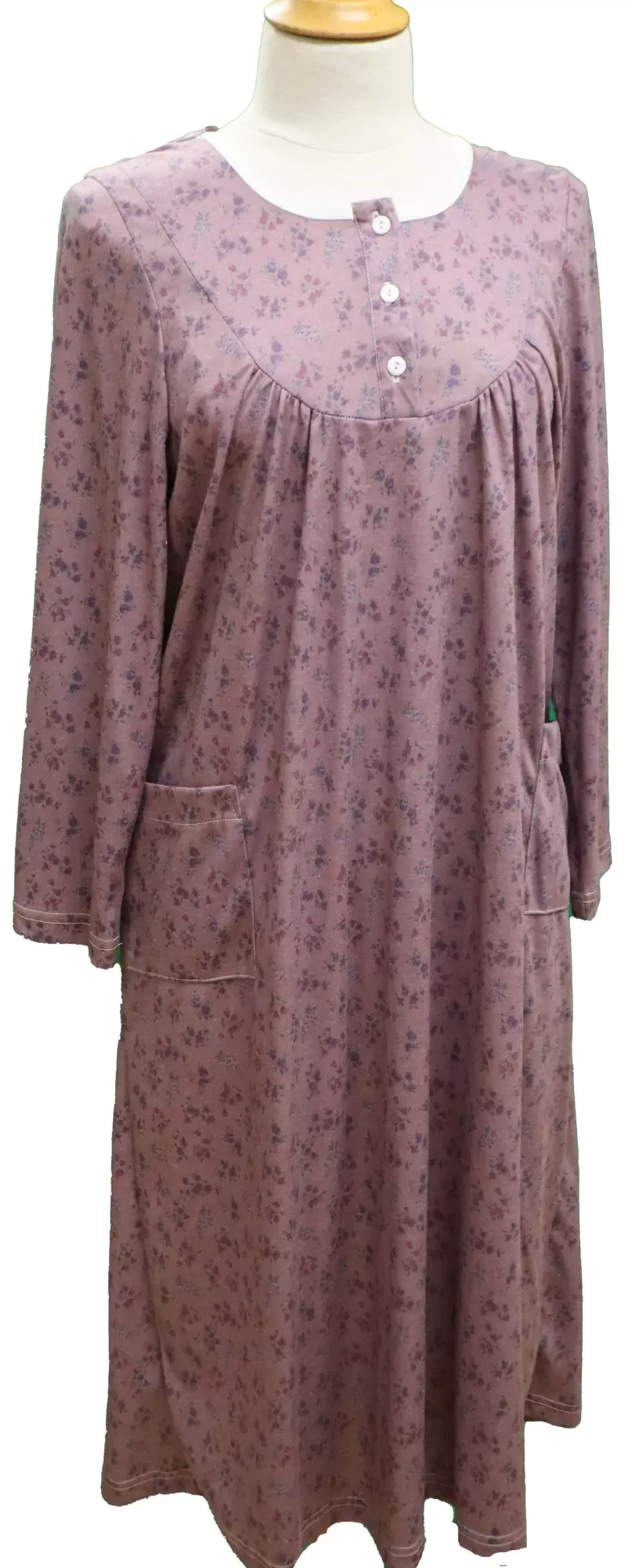 Robe de nuit à manches longues à motifs floraux en poly/coton doux. Ces charmants modèles offrent deux poches à l’avant avec de beaux détails. Facile à enfiler avec fermeture à boutons pression au dos.
