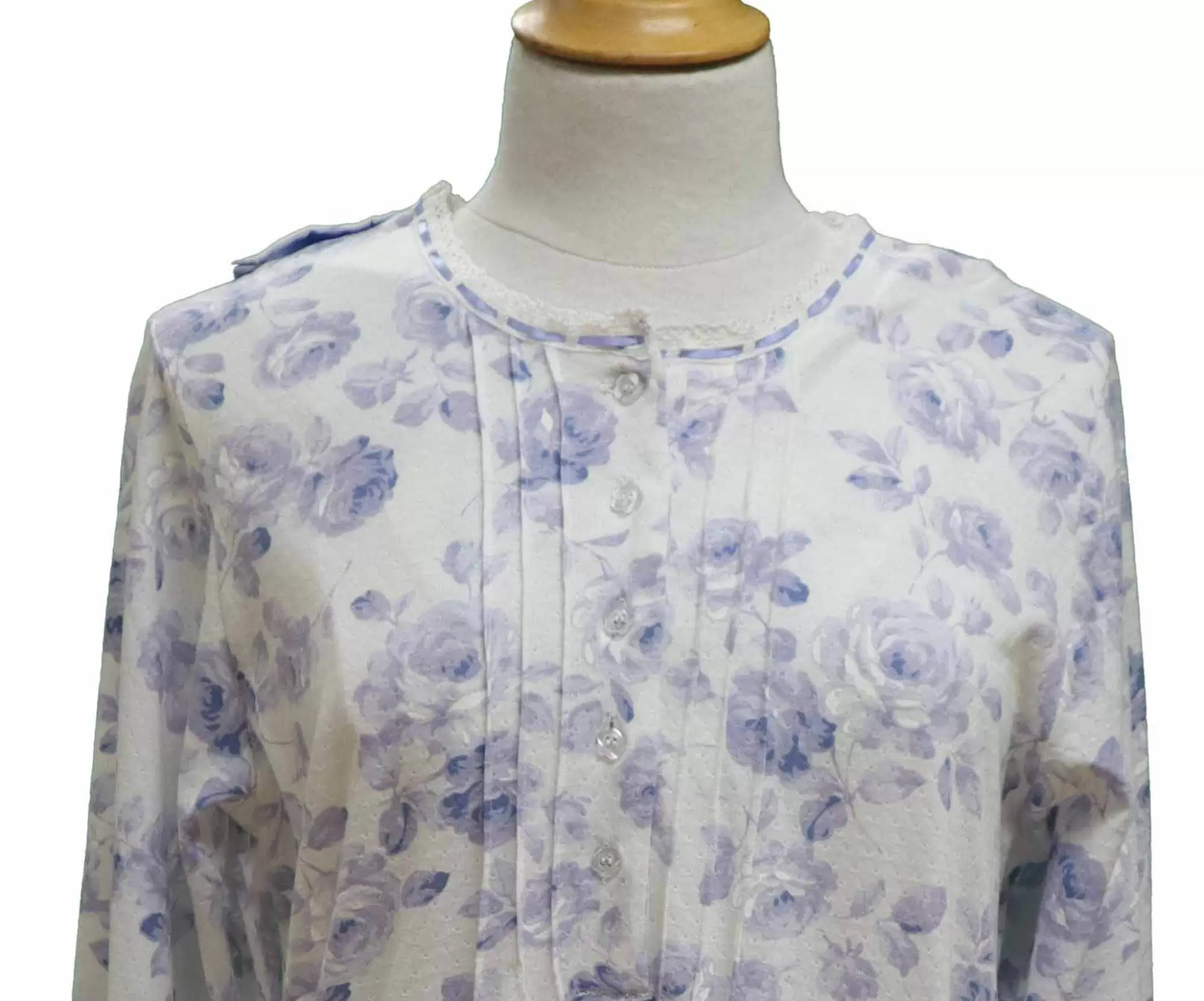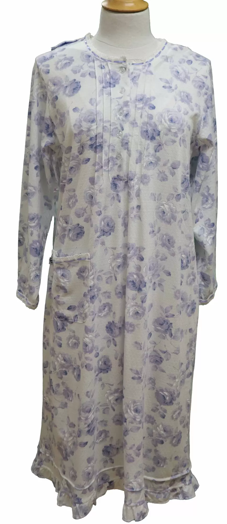 Robe de nuit à manches longues à motifs floraux en poly/coton doux. Ces charmants modèles offrent deux poches à l’avant avec de beaux détails. Facile à enfiler avec fermeture à boutons pression au dos.