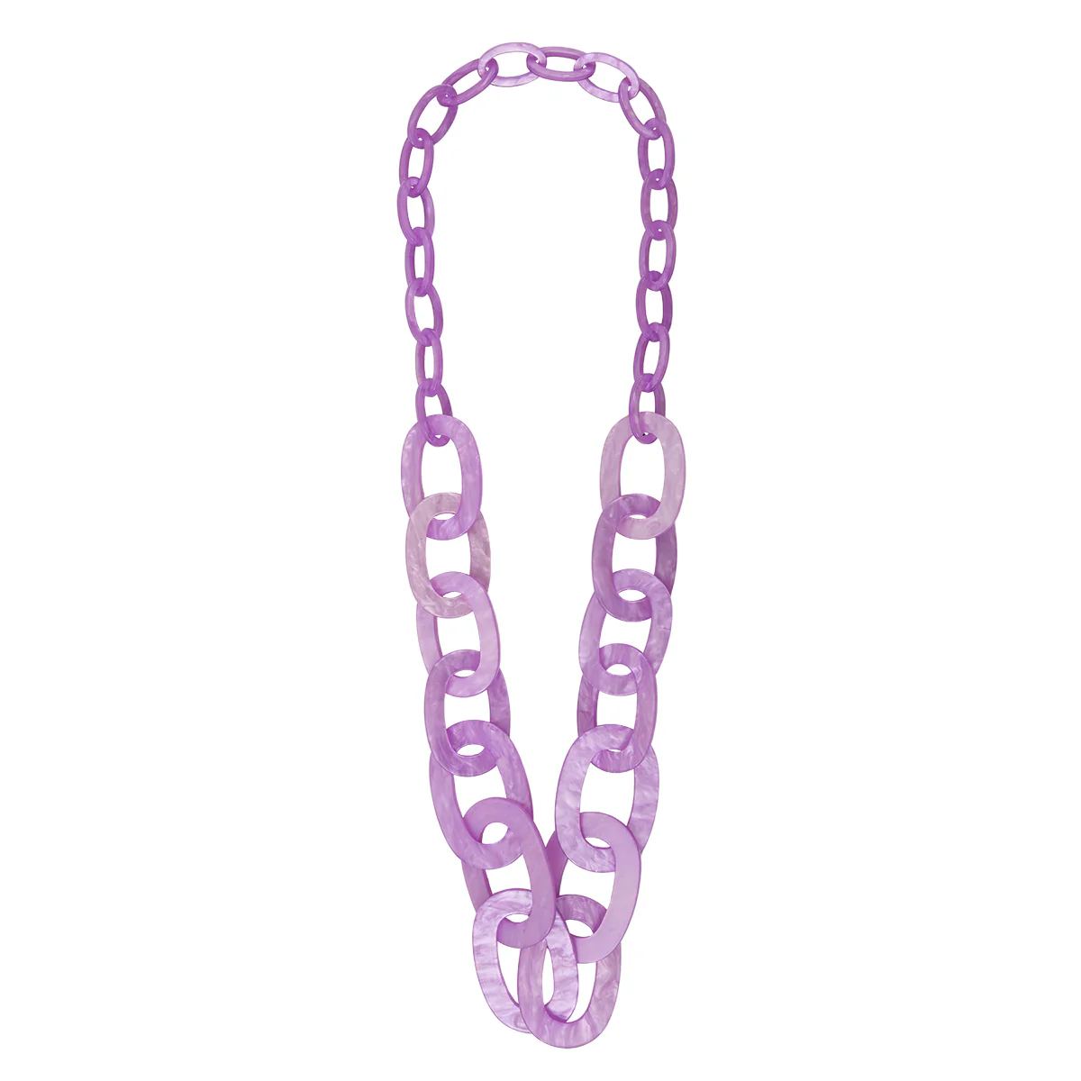 Sa palette de couleurs, allant du lilas clair à un violet profond, apporte une touche de fraîcheur à n’importe quelle tenue. Les maillons ovales entrelacés, de tailles variées, créent un effet de chaîne dynamique et contemporain, enrichissant visuellement votre look.