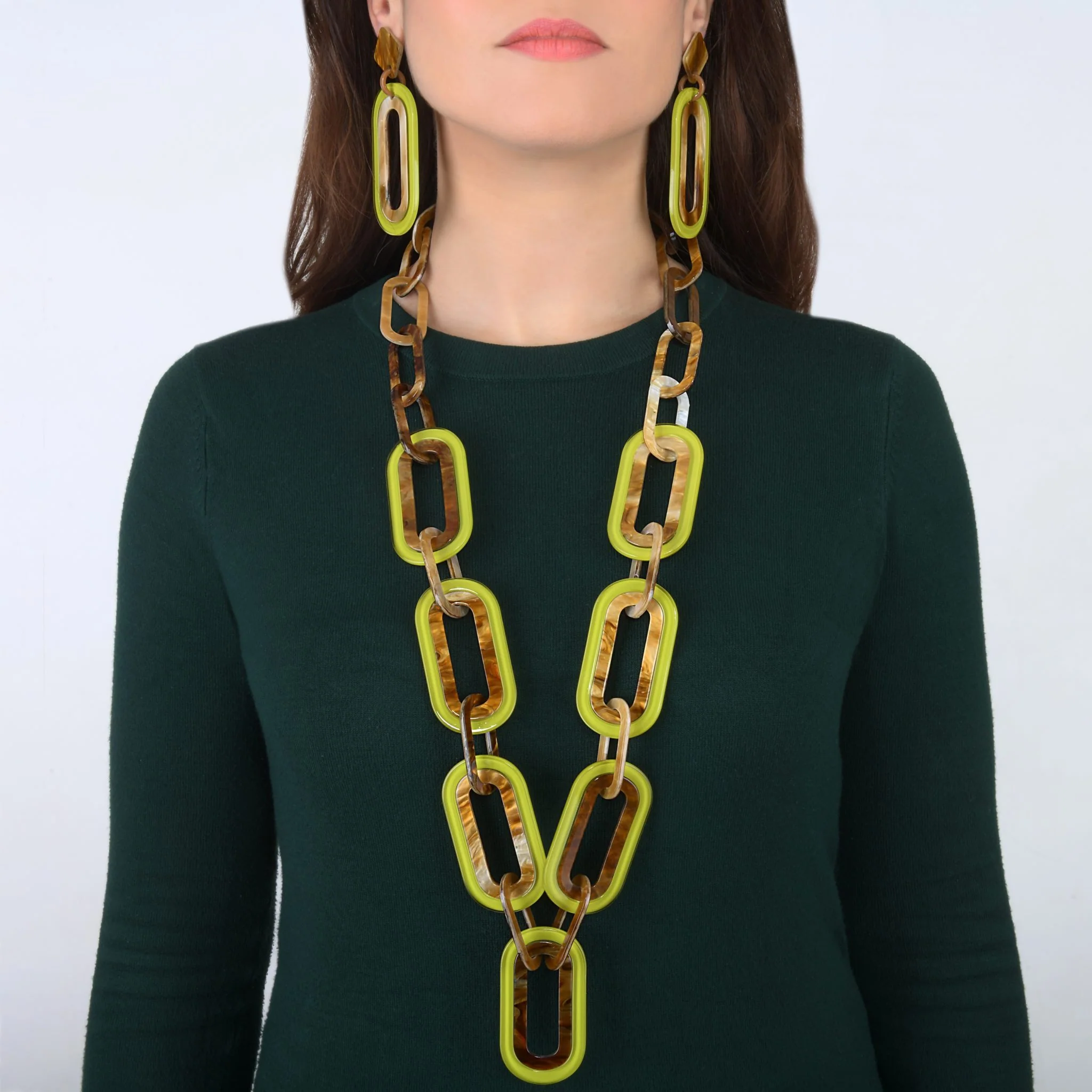 Ce sautoir se distingue par son design unique, composé de maillons en forme de rectangles allongés. Les maillons, de tailles variées, créent un effet dynamique qui attire le regard. La palette de couleurs, mêlant des nuances de vert translucide et de marron opaque, offre un joli contraste, idéal pour celles qui aiment se démarquer.