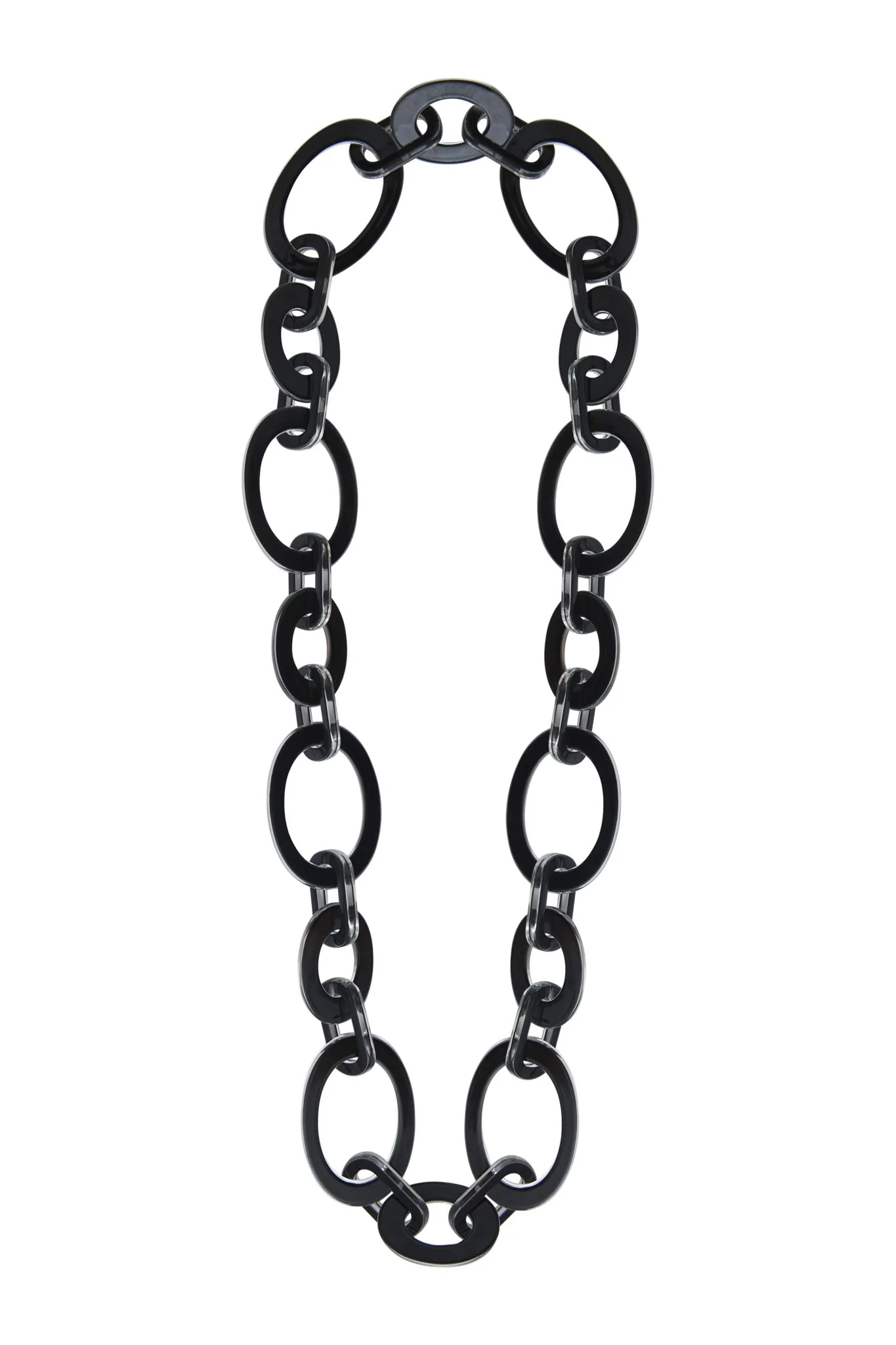 Fabriqué en plexiglas, ce sautoir se distingue par sa légèreté et sa brillance. Les maillons ovales, alternant entre des sections en plexiglas transparent et des sections laquées en noir, créent un contraste visuel captivant.