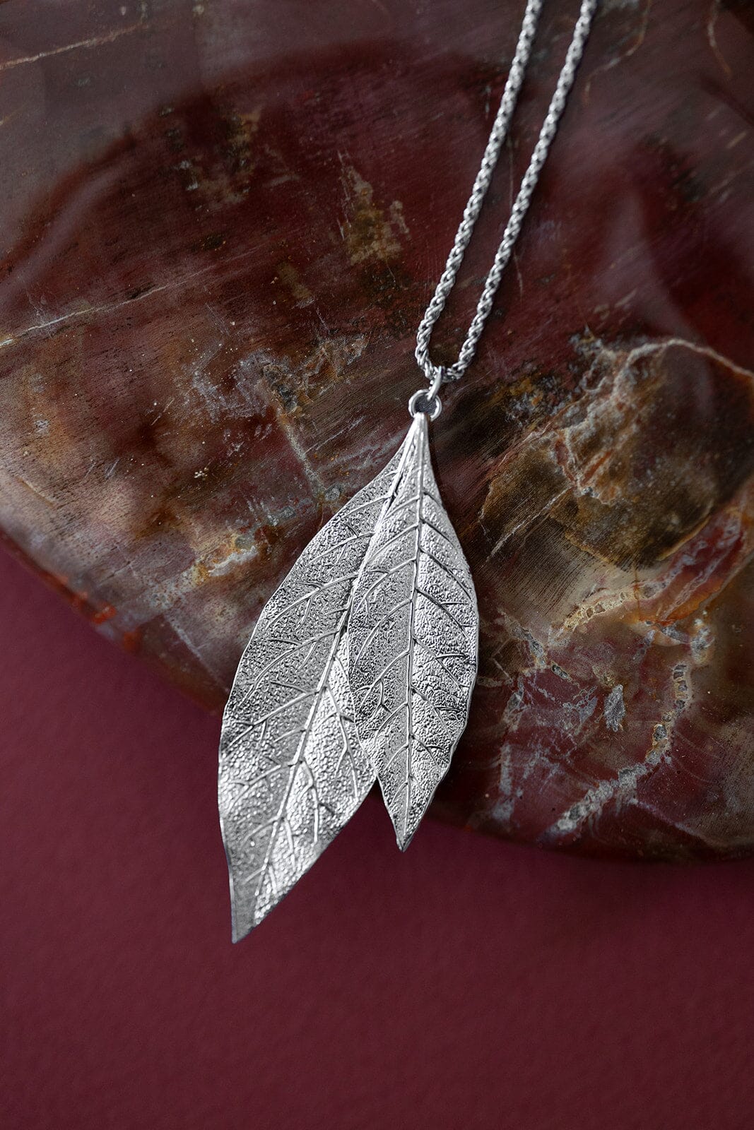 Sautoir Thalie en laiton plaqué argent avec une chaîne palmier – 80 cm – avec deux feuilles. Chaîne de réglage de 3 cm, fermoir mousqueton et médaillon gravé du logo.