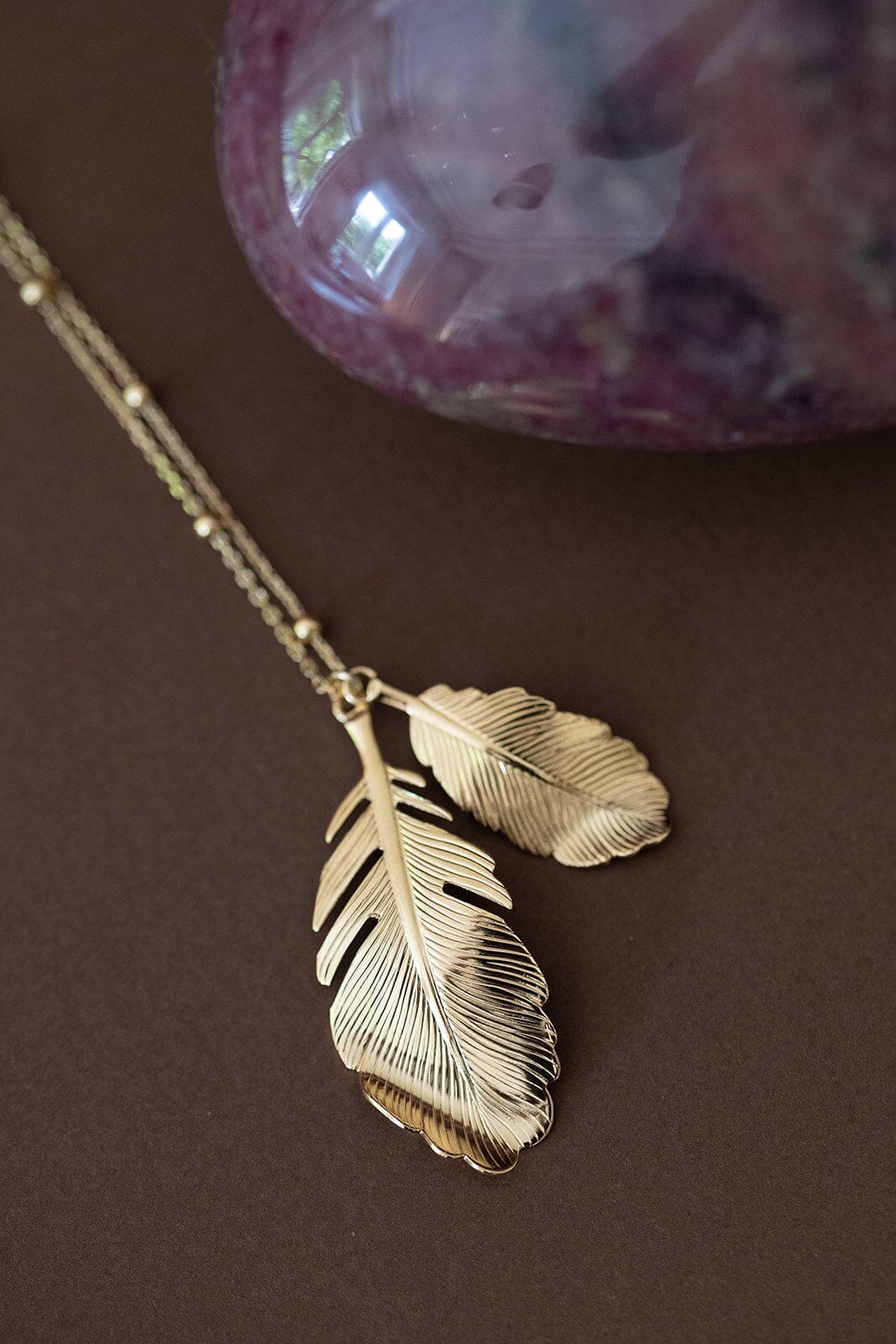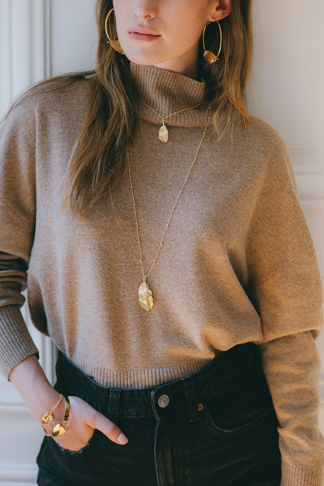 Sautoir Zéphyr en laiton doré à l’or fin 24k recyclé et certifié RJC-COC – 80 cm – avec deux feuilles. Chaîne de réglage de 3 cm, fermoir mousqueton et médaillon gravé du logo.